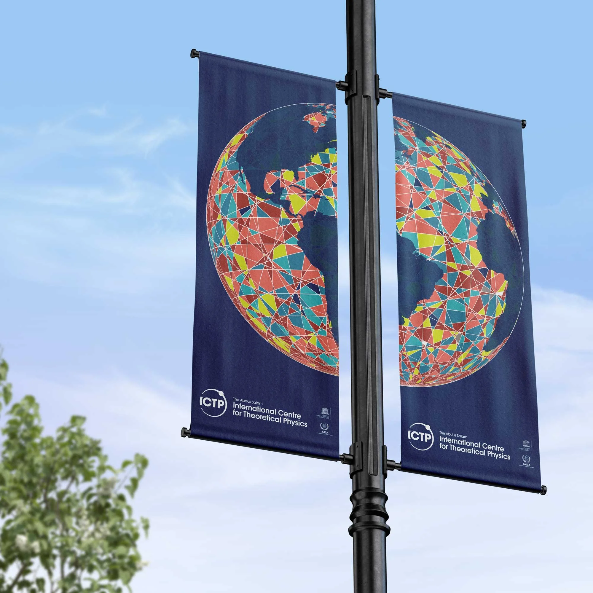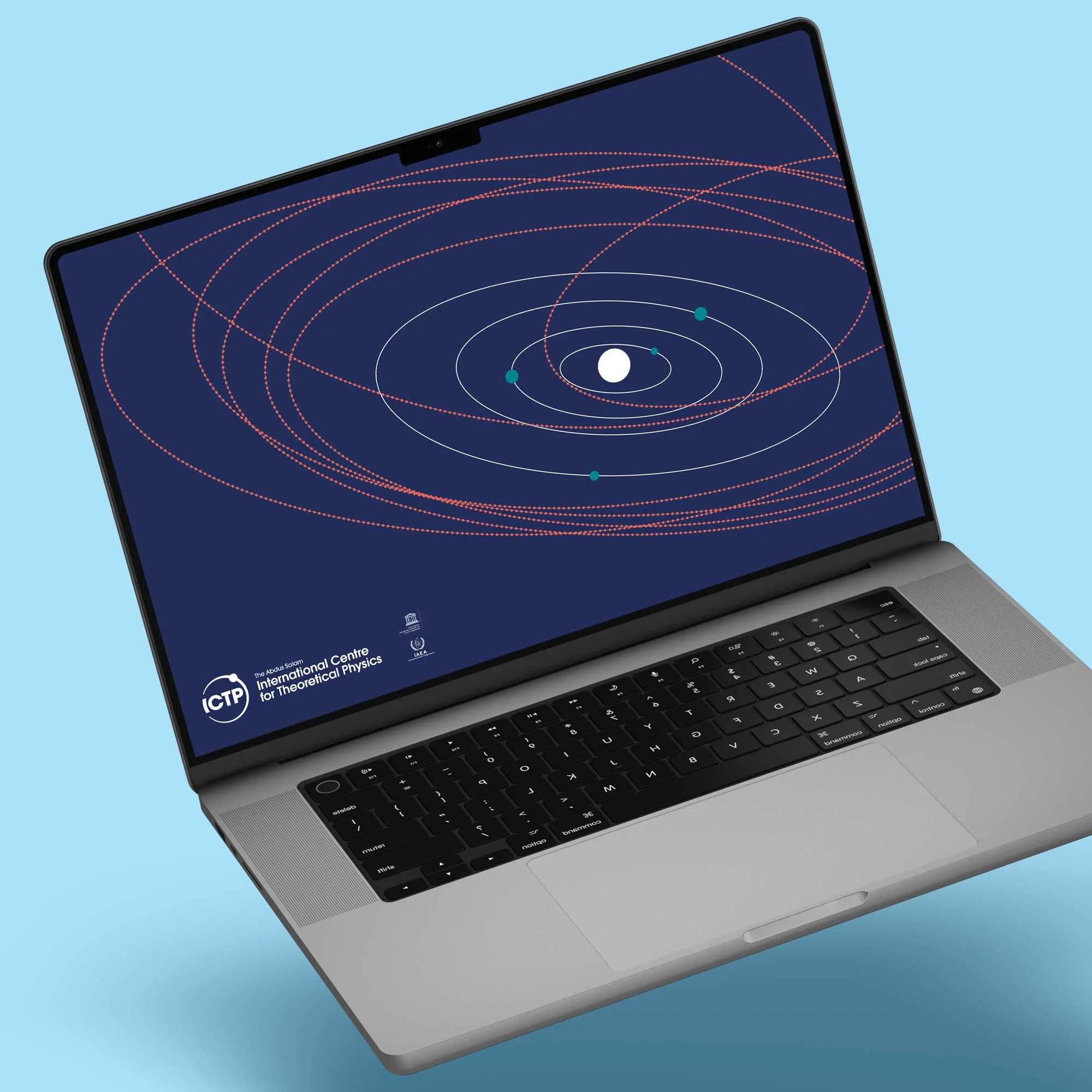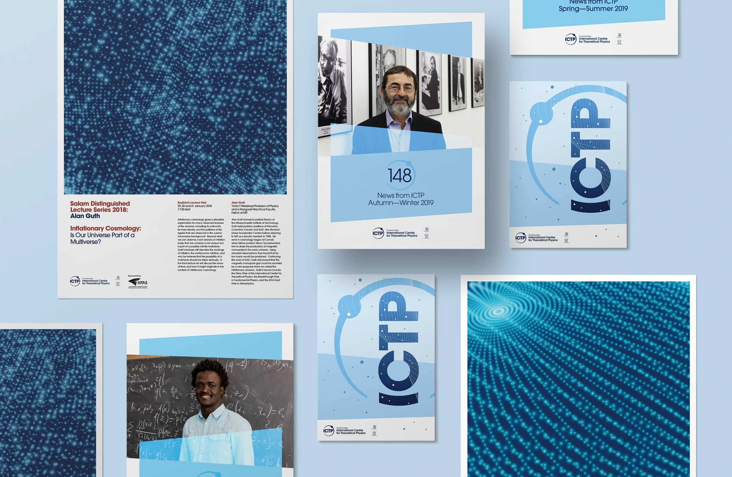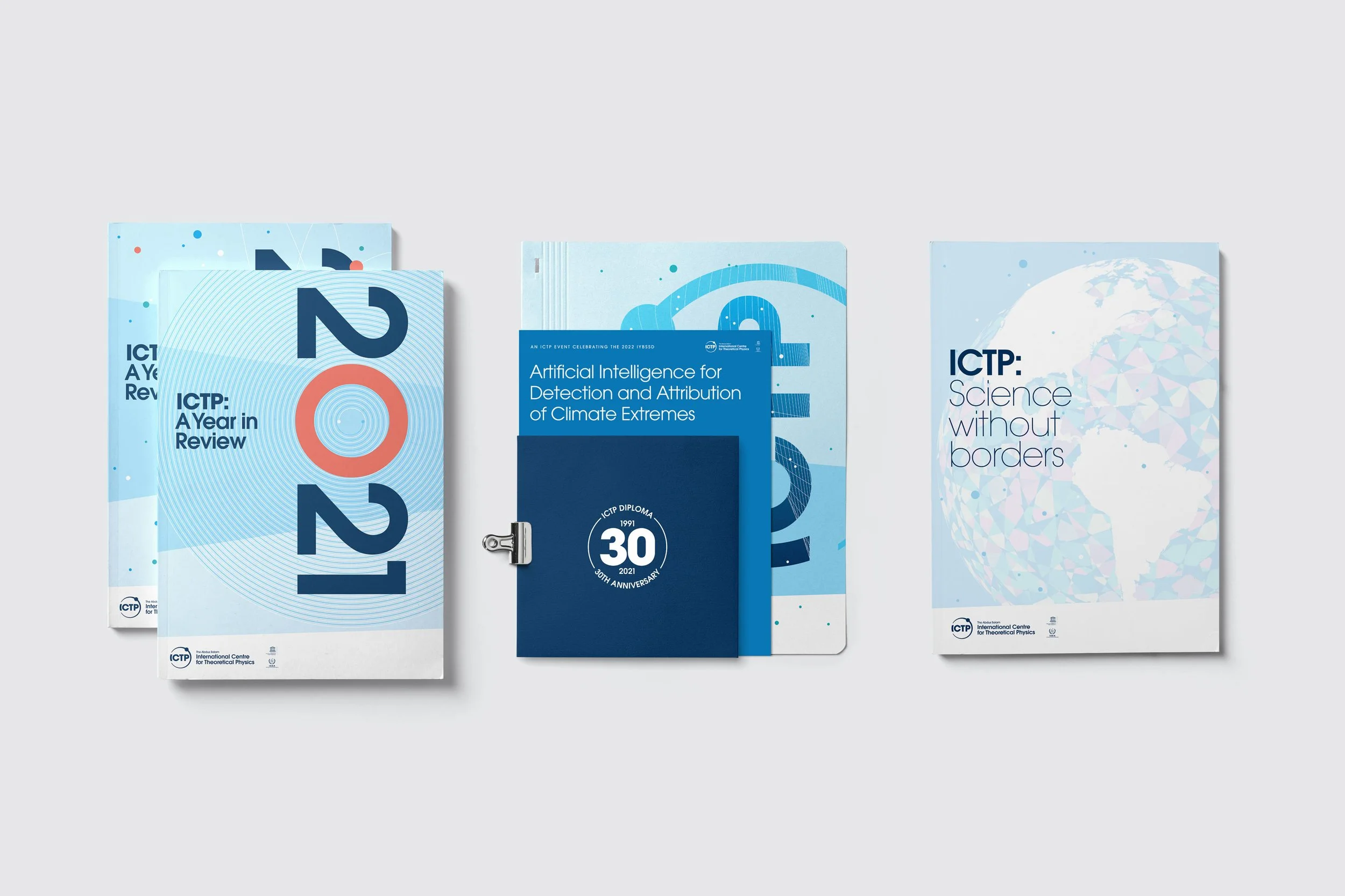 Central to ICTP’s mission is bringing together the scientific community from across the world. This concept is expressed in the graphic identity through a consistent use of circular motifs: orbits, spirals, atoms, orbs, spheres and globes.